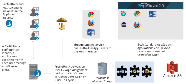 The following diagram represents the basic process of integrating FlexApp Layers within the AppStream platform.