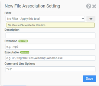 The File Associations module is used to create a mapping between a particular file extension and an associated executable, allowing you to control which default application should be started when using a certain file type. Optional command line options to use when running the executable can be specified as well. Admins can control which users are assigned which File Association rules by using Filters.