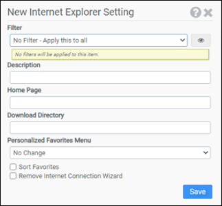 This module is used to configure Internet Explorer features such as Start Page, Download Directory, and Favorites. This module supports Internet Explorer versions 4.0 and higher.