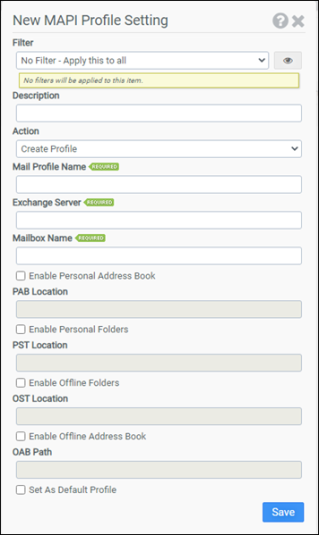 Selecting this option will configure the mail profile to use an offline address book. You will need to enter the complete path to the offline address book in the OAB Location field. This option is only available if Create Profile, Create - Only if No Profiles Exist, or Create - Only if No Profile Exists with this Name is selected as the Action.