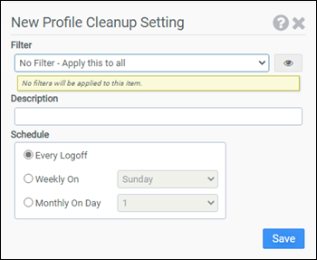 The Profile Cleanup module is used to clean up a user's profile contents. The Profile Cleanup rules are evaluated at user login. If the cleanup schedule for the user matches the desktop’s day of the week or day of the month, then a flag will be set to remove the user’s profile from that desktop at the user’s next logoff. Profile Cleanup applies to Windows 10 and higher or Windows Server 2012 machines and higher only.