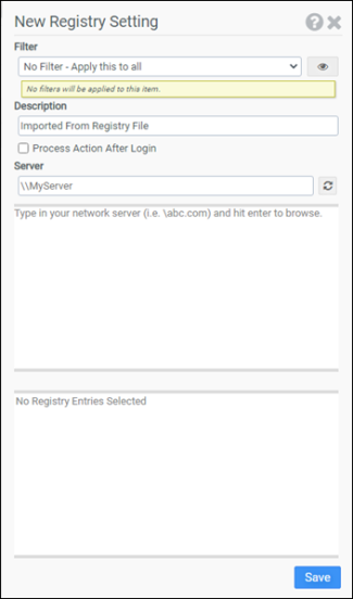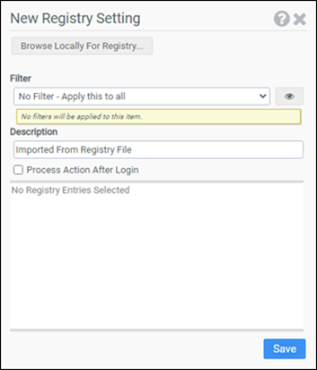 This module allows you to make changes to the registry on your client machines. Choose whether to add registry settings manually, browse local settings, or browse server settings to select registry settings.