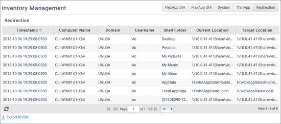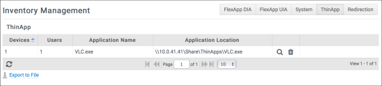 ProfileUnity’s Inventory Management screen contains tabs in the top right corner that provide administrators with an overall view of each of the FlexApp DIA packages, system inventory components, ThinApp packages, and redirects in the environment.
