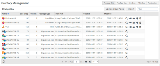 The FlexApp DIA tab shows admins all of the FlexApp DIA packages available for use in the FlexApp library. From this list, admins can view specific package information, delete packages, or disable/enable packages. Note that Liquidware Cloud apps cannot be modified or deleted because they are owned and maintained by Liquidware and made available to all FlexApp users.