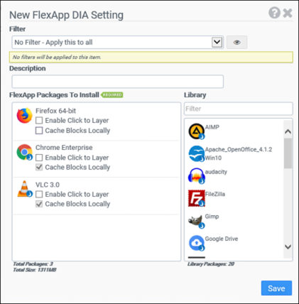 - (Optional) On the New FlexApp DIA Settings screen that pops up, select a Filter for this configuration element to apply this FlexApp DIA rule to certain users or groups.