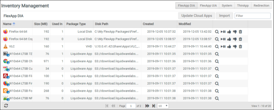 The Inventory Management screen opens with the FlexApp DIA tab displayed. All applications that have been packaged and created as cloud, VHDX, or local disk types to be used by FlexApp appear in the list on the screen.