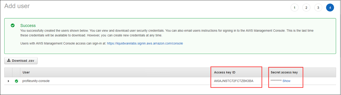 - The new user will be created. At this time, you will be given the user’s Access Key ID and Secret Access Key. Make sure to document these credentials and keep them in a safe place. You can also download them as a CSV file. If you forget or lose these keys, you will NOT be able to access them again. However, you can create a new Access and Secret key to reset your credentials.