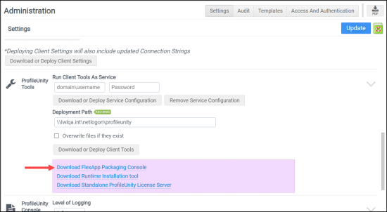The FlexApp Packaging Console allows administrators to configure and prepare any applications that will need to be configured for users and made available as a department installed application from within the ProfileUnity Management Console. The FlexApp Packaging Console installer can be downloaded from the Administration screen of the ProfileUnity Management Console. Installation is easy and straightforward.