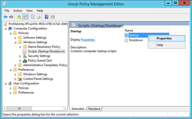 Installation of the ProfileUnity Client is triggered through Group Policy computer startup scripts. To configure the startup script for the ProfileUnity GPO, complete the following steps:
