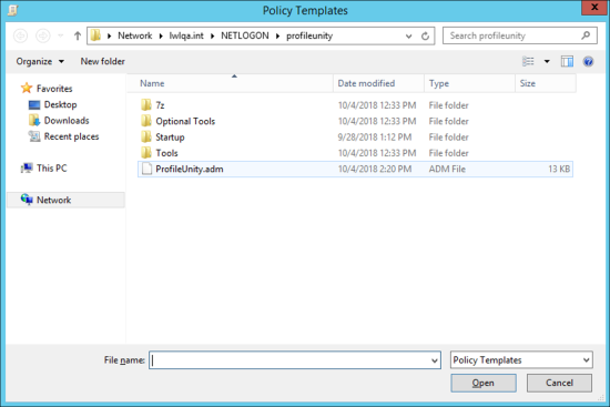 - Browse to the location where you extracted the ProfileUnity Client files. By default, this is the NETLOGON\profileunity folder stored in your domain. Select the ProfileUnity.adm template, then click the Open button.