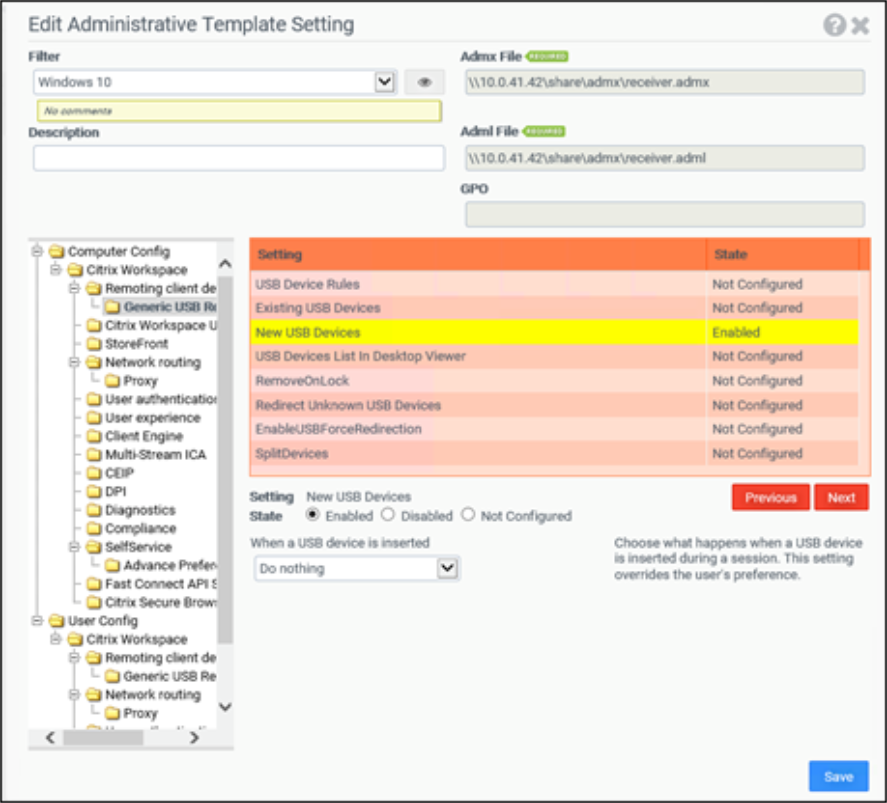 After a pair of ADMX and ADML files are imported, determine which settings to enable, disable, or leave not configured. For enabled settings, input custom values into the provided controls (if any). Here is more information on what the various states mean: