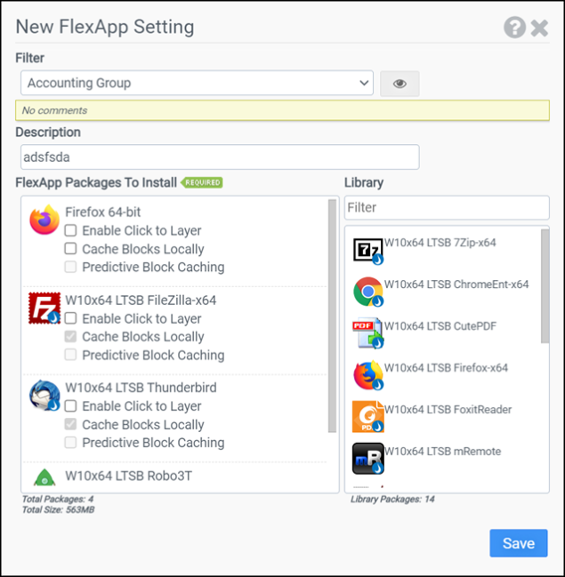 - Predictive Block Caching: Use the Predictive Block Caching feature to download and cache a specific set of blocks that are needed on startup from a FlexApp VHDX file to help applications load faster without waiting on blocks to download. This option requires the set of blocks be prerecorded by the FlexApp Packaging Console while loading the application. If the startup blocks have not been recorded, this option will be disabled in the FlexApp configuration module. Selecting Predictive Block Caching also automatically selects the Cache Blocks Locally option.
