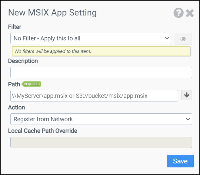 Note: A cloud path will be processed as if the option Register from Local Cache was selected even if Register from Network (App Attach) was actually chosen. A VHD/VHDX/CIM (for App Playback) will be processed as if the Register from Network option was selected. Cloud-based CIM files are not supported because of their multi-file nature.