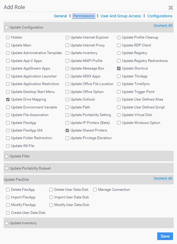The Role Management section of the Access And Authentication tab allows users to assign specific Management Console editing permissions for each Active Directory user account. This feature makes it possible to have leveled roles within a help desk team which allows certain changes to be made by some users while reserving other edits for higher level admins. For example, a level-one role might include the ability to change drive mappings, printer settings, and shortcut settings but not allow users assigned to that role to change filters, portability, or FlexDisk settings. By default, only local admin users can make edits in the ProfileUnity Management Console. All other Active Directory users can view the current settings but are unable to make edits until roles are assigned. Roles open up access to grant granular editing permissions within the ProfileUnity Management Console. However, ProfileUnity cannot grant or override server user account permissions.