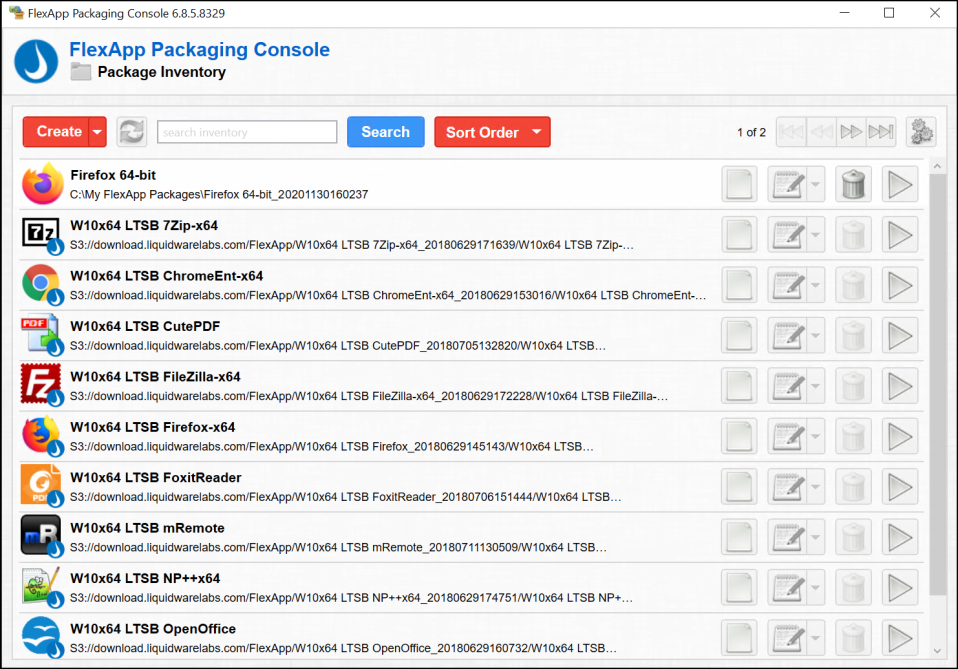 When you log in to the FlexApp Packaging Console, the Package Inventory screen appears, listing all available FlexApp Packages. Starting with version 6.8.0, several popular FlexApp packages are included automatically in the inventory list, ready for immediate use via cloud storage. If a FlexApp package is a Liquidware app, the