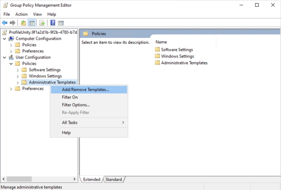 ProfileUnity uses Microsoft Active Directory (AD) and Group Policy Management for managing the users and computers configured to use the software and for activating the ProfileUnity Client without actually installing the agent on each of those individual physical or virtual desktops. Consequently, there are some administrative tasks outside of installing the ProfileUnity software where administrators need to configure some Active Directory and Group Policy settings. The ProfileUnity Management Console can automate configuring some of the Group Policy settings after the ProfileUnity Organizational Unit (OU) has been created, or you can choose to manually configure your AD settings.