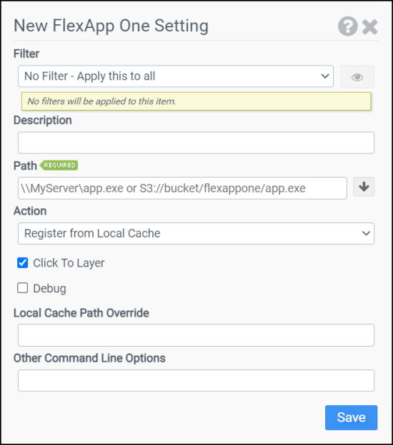Add any other Flexapp One command line flags desired (see FlexApp One Documentation).