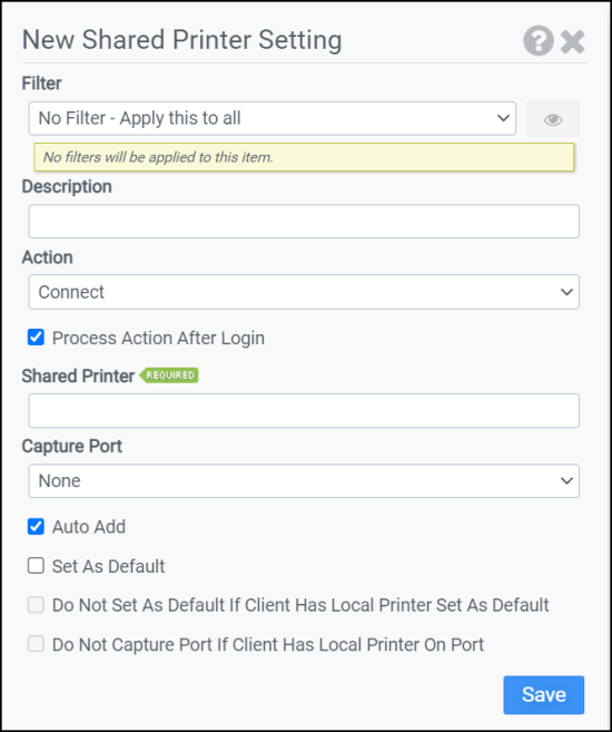 Note: This option leverages Microsoft Point and Print technology. The printer and drivers must be properly configured on the server for this option to function. The easiest way to test Point and Print is to attempt connecting to the printer from a client. If a client machine can connect without prompting for drivers, Point and Print is properly configured.