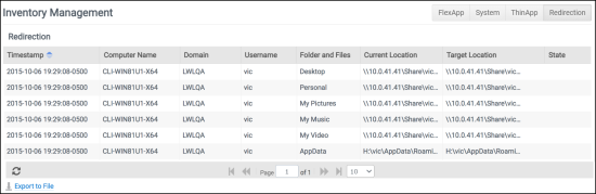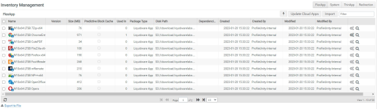 ProfileUnity’s Inventory Management screen contains tabs in the top right corner that provide administrators with an overall view of each of the FlexApp packages, system inventory components, ThinApp packages, and redirects in the environment.