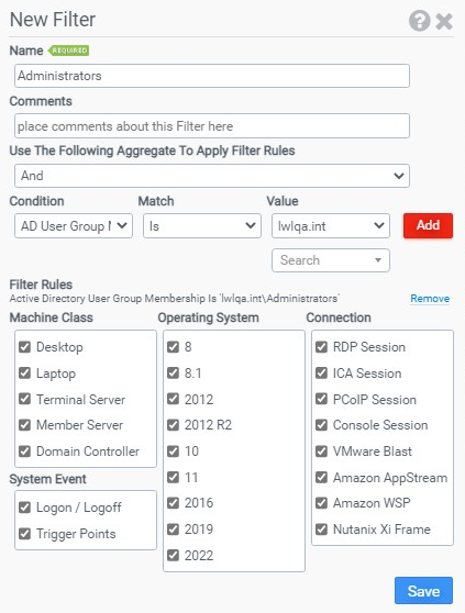 Filters consist of the following elements: a filter name, filter rules, machine classes, operating system platforms, connection types and system events.