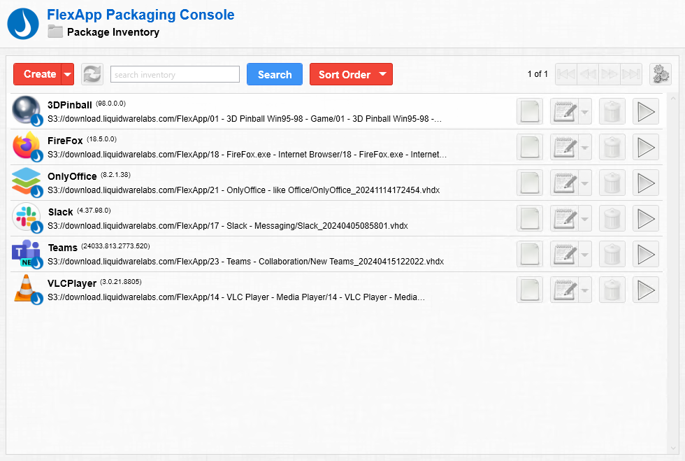 After logging in to the FlexApp Packaging Console, you will see the Package Inventory which lists all available FlexApp Packages. Starting with version 6.8.0, you will notice several FlexApp packages are automatically included in your inventory list. Liquidware has pre-packaged some popular applications and made them available to all users for immediate use via cloud storage. If a FlexApp package is a Liquidware app, the