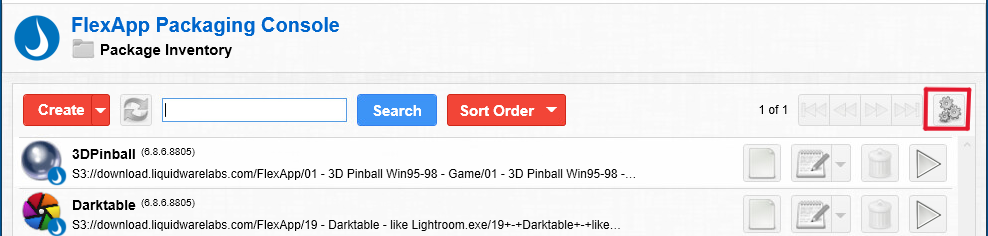 The Settings screen that opens when you click the Gears button displays the software release number and the software version number for the FlexApp Packaging Console you have installed.