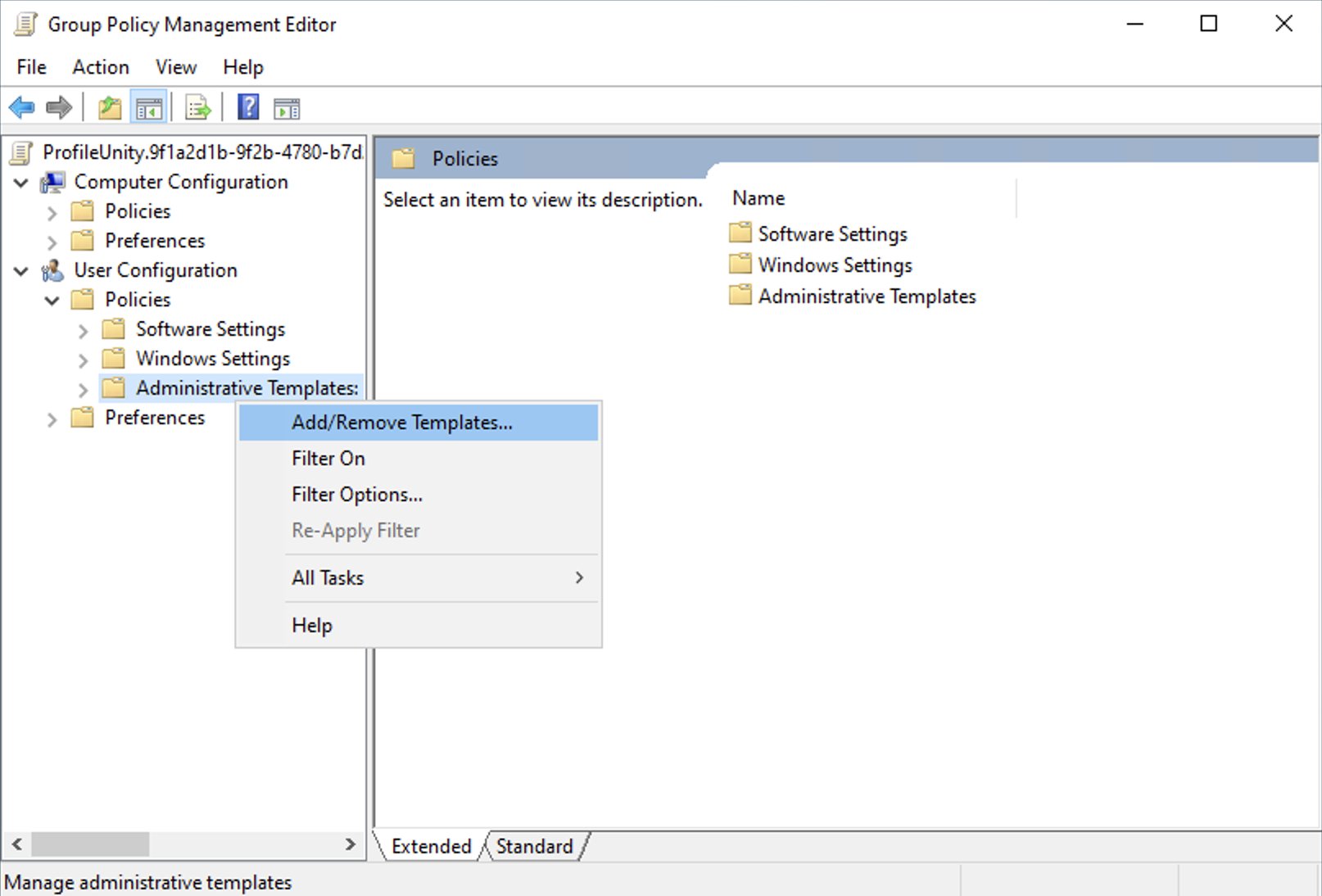 - Right-click the Administrative Templates folder and select the Add/Remove Templates option.