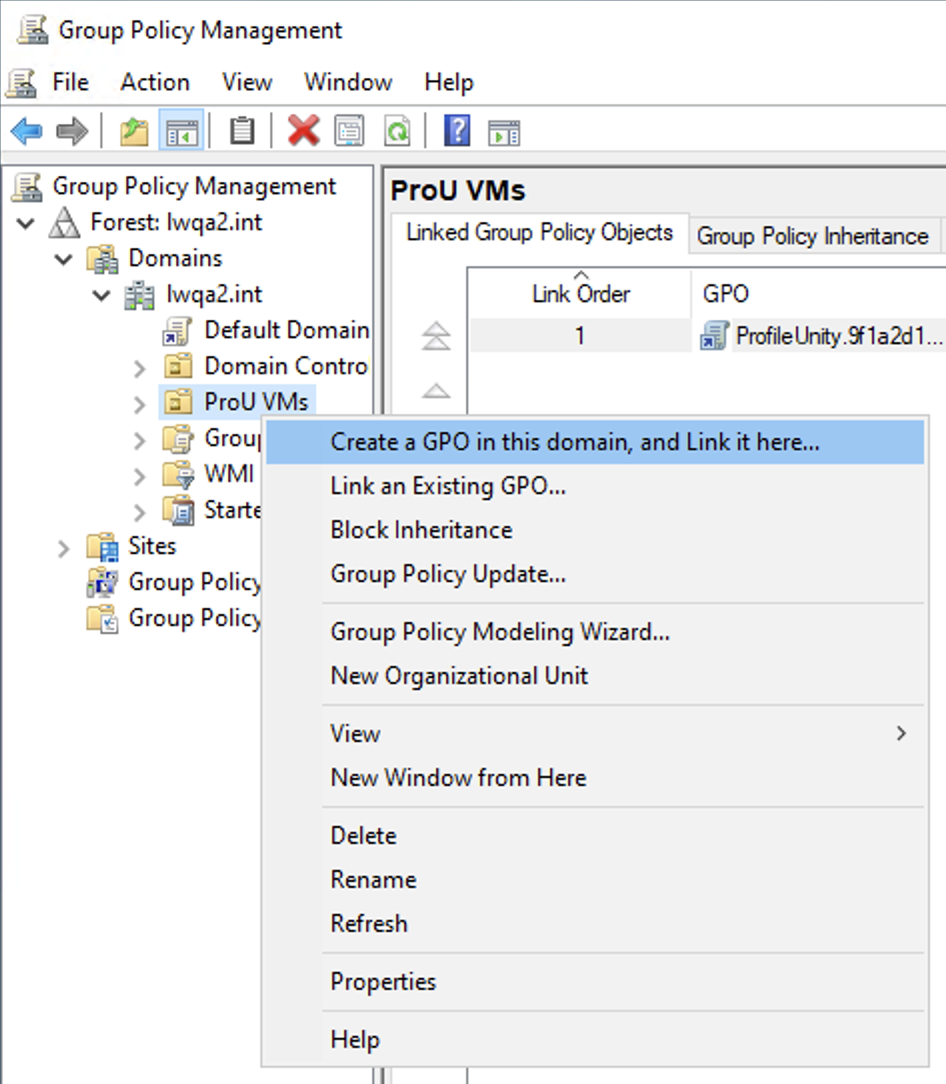 - Right-click your ProfileUnity Computer OU and select Create a GPO in this domain, and Link it here… to create a group policy and link it to this OU.