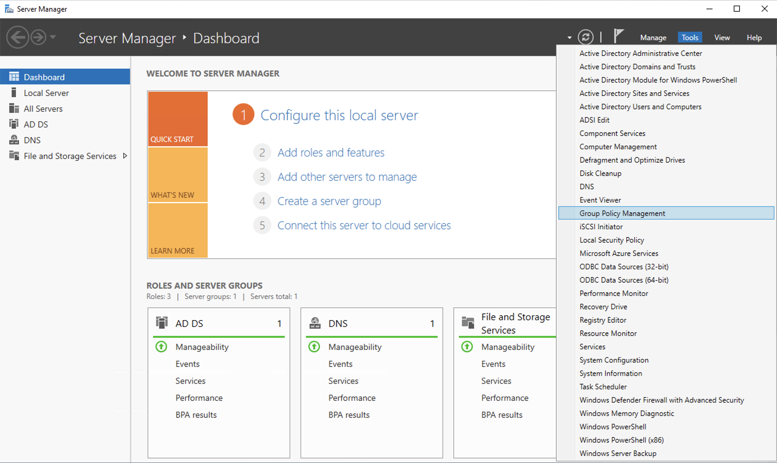 - To open the Group Policy Management Console in a Windows Server 2016 or newer Domain Controller, start the Server Manager Dashboard, click the Tools menu, and select Group Policy Management from the drop-down menu that appears.