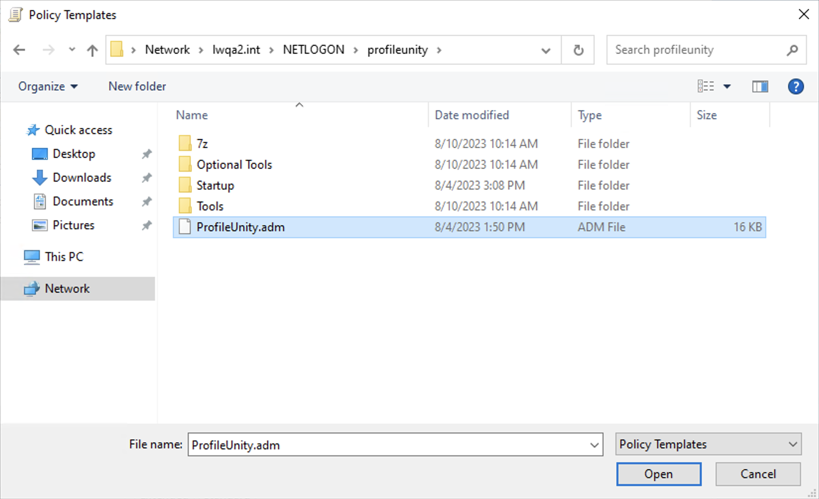 NETLOGON\profileunityfolder stored in your domain. Select theProfileUnity.admtemplate, then click the Open button. -