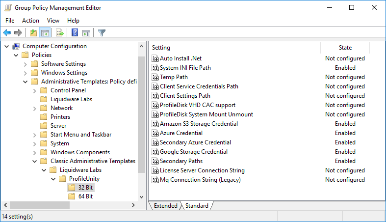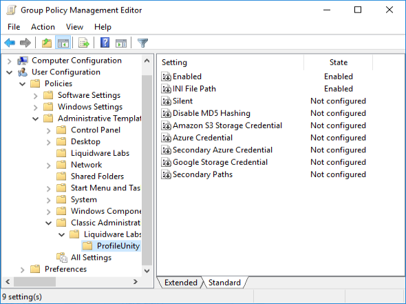 - On the left side of the editor, go to Computer Configuration > Policies > Administrative Templates > Classic Administrative Templates (ADM) > Liquidware Labs > ProfileUnity.