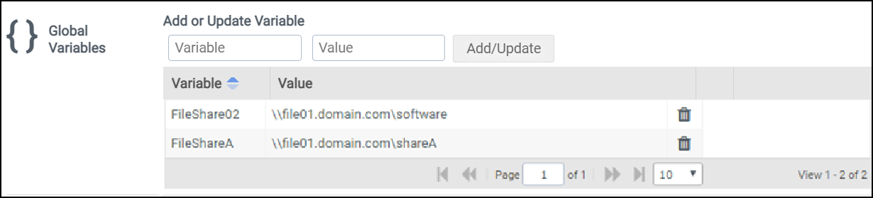 To set up global variables for use in your environment, enter a Variable Name and a Value. Then click Add/Update to either add a new variable or update an existing value.