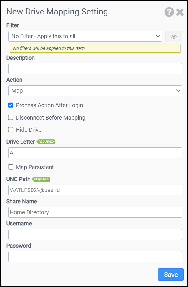 Example 2 leverages the macro @USERID. When ProfileUnity executes, the @USERID macro is expanded into the username. Therefore, the H: drive will be mapped to a per-user share located on server ATLFS02. The drive will be mapped persistent and will be assigned the label Home Directory after the user logs in.