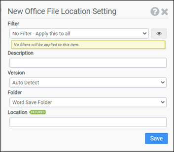 This module allows you to modify the default file locations for Microsoft Office. This module supports Office 2003/2007/2010/2013/2016.