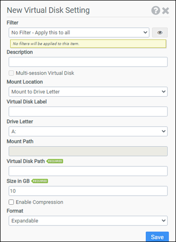 This example will create a new VHDX with the label of VirtualDisk_A and a fixed size of 10GB. The disk will not be compressed when created nor will Multi-session be enabled. The disk will be placed in \\mydomain\vd and mounted to drive letter A:. The disk will be mounted for all users.