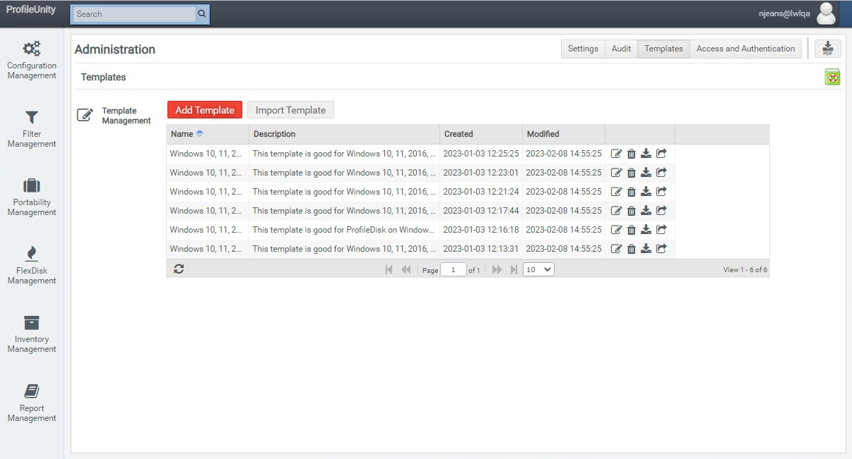 - The Template list that appears contains all of your existing configuration templates including the standard templates that come with ProfileUnity.