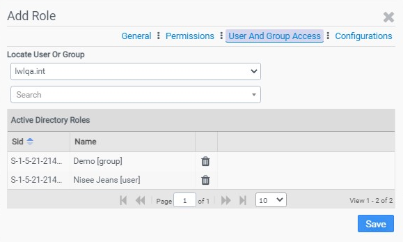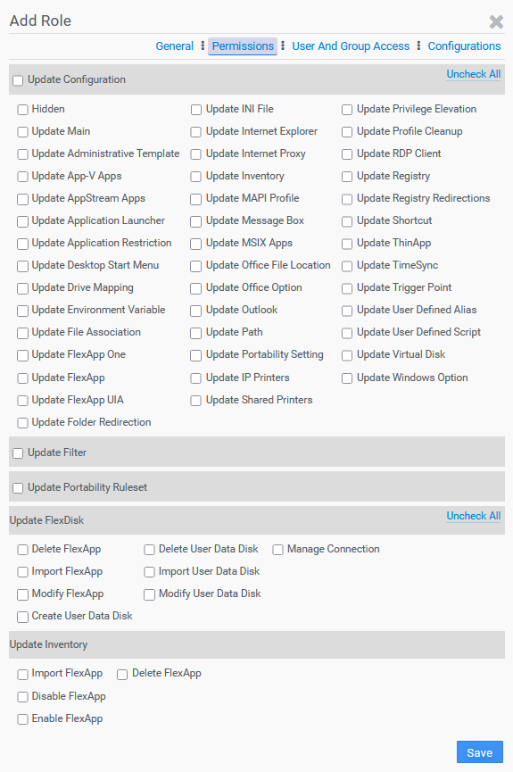 The Role Management section of the Access And Authentication tab allows users to assign specific Management Console editing permissions for each Active Directory user account. This feature makes it possible to have leveled roles within a help desk team which allows certain changes to be made by some users while reserving other edits for higher level admins. For example, a level-one role might include the ability to change drive mappings, printer settings, and shortcut settings but not allow users assigned to that role to change filters, portability, or FlexDisk settings. By default, only local admin users can make edits in the ProfileUnity Management Console. All other Active Directory users can view the current settings but are unable to make edits until roles are assigned. Roles open up access to grant granular editing permissions within the ProfileUnity Management Console. However, ProfileUnity cannot grant or override server user account permissions. Users do not have to be Active Directory Administrators in order to be assigned roles.