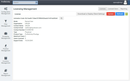 ProfileUnity with FlexApp includes a License Service that provides improved license management and greater flexibility with real-time usage in your environment. By default, ProfileUnity is designed to operate in evaluation mode for up to 5 users and up to 15 days. After the evaluation period expires, administrators will no longer be able to download any changes to their Configurations. To request an extended evaluation period or to purchase a software license, contact the Liquidware Sales Team.