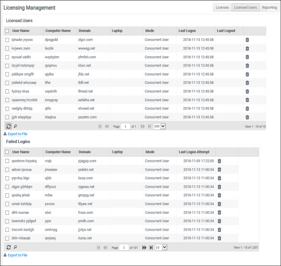 The Licensed Users tab contains two tables. The first list displays users who are currently licensed for ProfileUnity. The second list displays users whose license requests failed at login due to the number of users requesting licenses exceeding the license count. Administrators have the option to remove users from these searchable, sortable lists in order to free up licenses. The Export to file option allows you to export the users in that list to a CSV file.