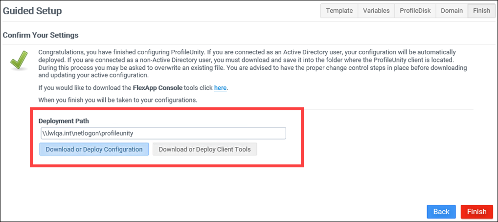 The Deployment Path is again displayed as the last step in the Guided Configuration Wizard. From here, you can deploy the new Configuration as long as you are logged in as an Active Directory user. To have ProfileUnity copy the Configuration INI file to the specified Deployment Path, click the Download or Deploy Configuration button and deploy the Configuration. If you are logged in as a non-Active Directory user, click the Download or Deploy Configuration button and download the Configuration to manually copy the Configuration INI to your Deployment Path.