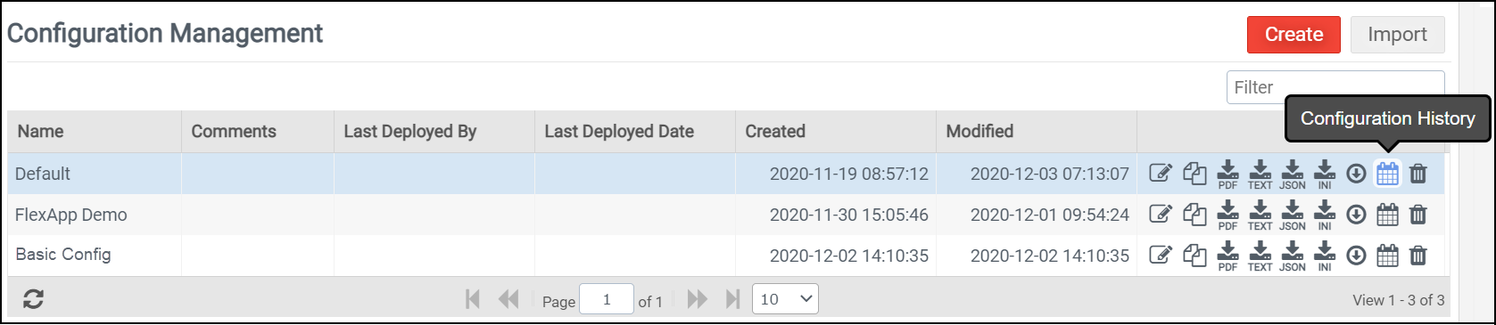 To remove an old or unused configuration from the Configuration Management screen, click the Delete icon next to the name of the configuration, then confirm that you want to proceed with the deletion. Note that after the configuration is deleted, it cannot be recovered.