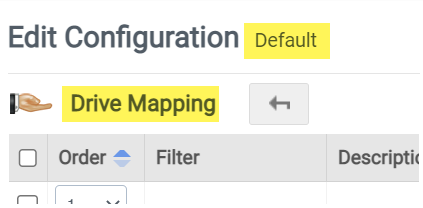 Each entry inside a configuration module is referred to as a configuration rule, and with the exception of the Main module, all modules allow you to create multiple configuration rules. The name of the ProfileUnity configuration that is being edited appears to the right of the words Edit Configuration. The name of the configuration module that is being edited appears below the words Edit Configuration. In the image below, for example, the Drive Mapping module within the Default configuration is being edited.