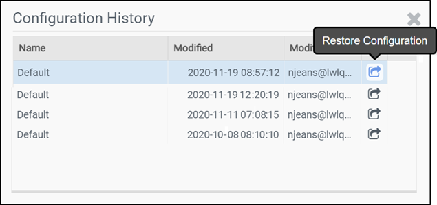 To restore any of the last five versions of a particular Configuration, click the Restore Configuration icon to the right of the Configuration date and time stamp.