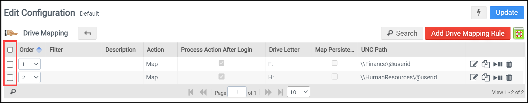 Clicking the Add…Rule button creates a new configuration element, which is then displayed in the Configuration Module Editor. In the image below, the Drive Mapping configuration module appears with multiple configuration rules defined.