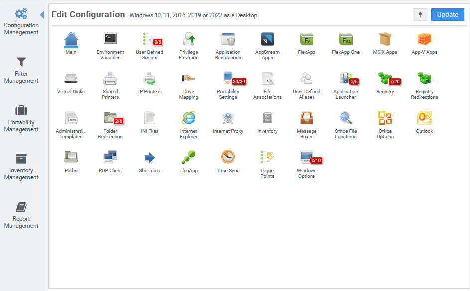 Your user and environment settings are stored in one or more configuration files, which are used to control ProfileUnity’s execution. During user logon, the ProfileUnity Client reads your configuration files and applies the settings to your client machines. Maintaining these files is accomplished by clicking the Configuration Management option in the left column of the ProfileUnity Management Console.
