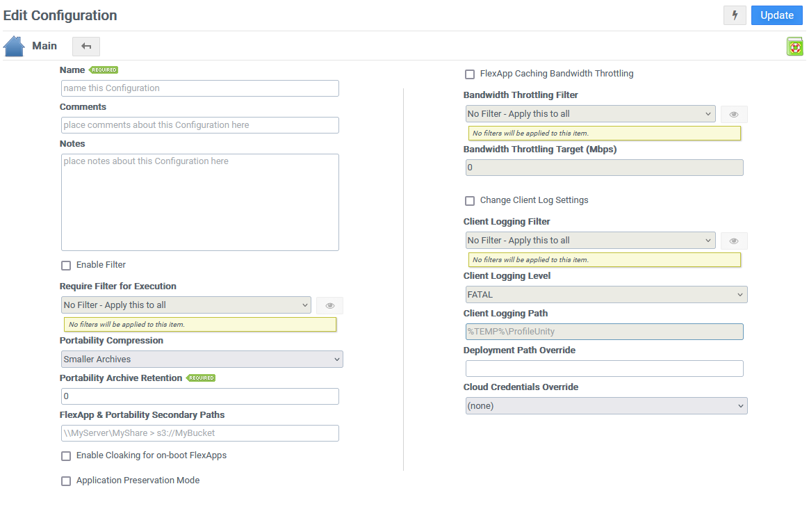 When you have finished editing a configuration, click the Update button in the top right corner of the screen to save your changes. All unsaved changes are discarded when you leave the Configuration Management screen.