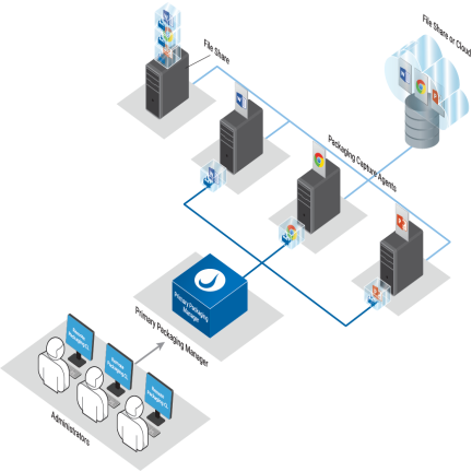 This architecture would allow packaging jobs to be submitted from the Primary Packaging Manager or remotely by one or more admins using the Remote Packaging CLI. In addition, you can conserve resources and use your existing ProfileUnity Management Console machine as the Primary Packaging Manager.