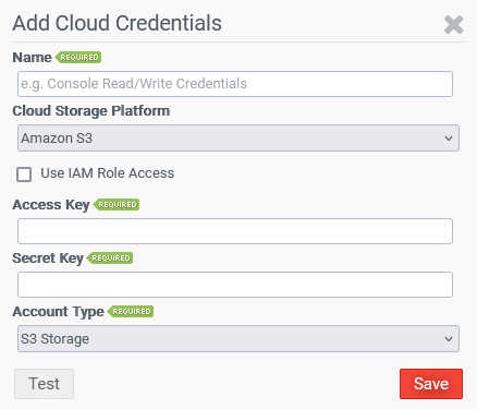 - When you select this checkbox, the Access Key and Secret Key fields are grayed out. This feature allows the customer to build-out an IAM Role that allows any device in their Amazon environment and VPC to automatically be approved to communicate with the S3 bucket without credentials.