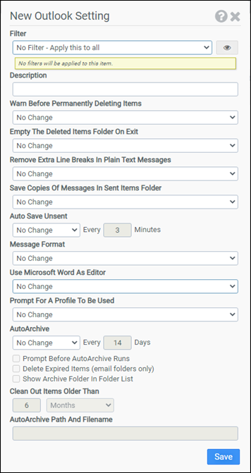 This module allows you to modify settings that control Microsoft Outlook’s behavior for message handling, message format, and AutoArchive.