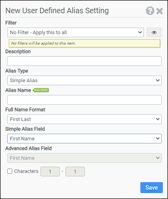 The Simple Alias Fields are derived from the Full Name field. Select the field containing the values you want assigned to your Alias Name. This option applies to Simple Aliases only. Choose from: